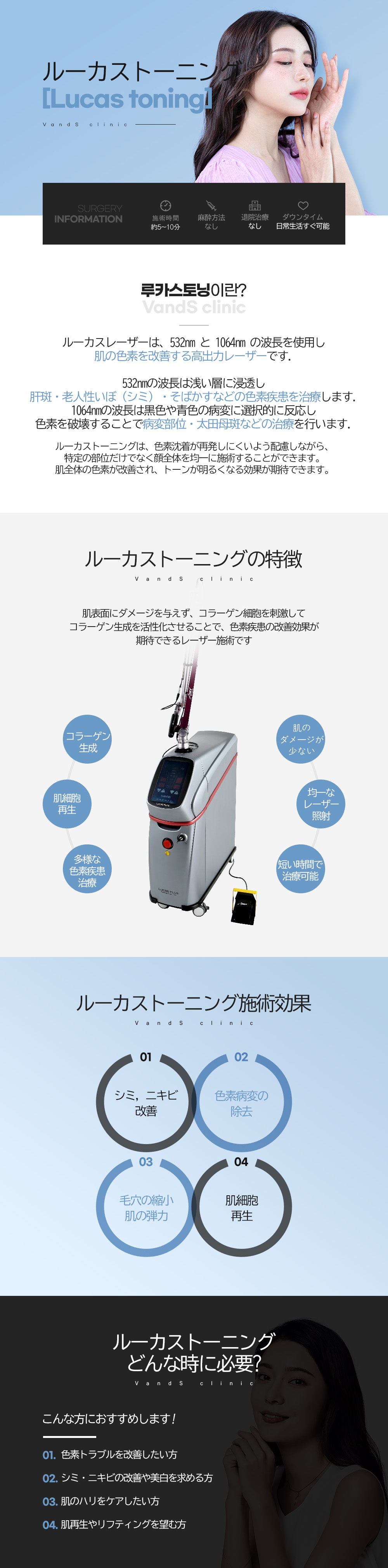 色素病変に高いピークパワーエネルギーを15Hzの瞬間的な高速放出で色素のみを選択的に破壊するレーザートーニング機器です。